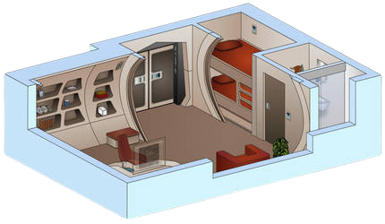 Description | Each person is assigned approximately 85 square meters of personal living quarters space. Couples are accorded a slightly larger space. Accommodations typically include a bedroom, living/work area, and a small bathroom. Living quarters decks are designed to be modular with movable walls to permit reconfiguration for requests as crew load and structure change. Other amenities available include food synthesizer terminals (replicators), sonic showers, standard showers, null-grav sleeping chambers, and personal holographic viewers. Individuals assigned to a starship for more than six months are permitted to reconfigure their quarters within hardware, mass and volume limits. Individuals assigned for shorter periods are generally restricted to standard quarters configurations. In some cases crew may be asked to share quarters. In this event the quarters will be provided with bunk beds. |